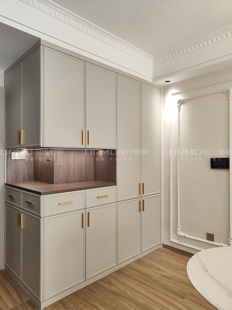 轉角玄關餐邊柜一體設計,采用模壓造型柜門,將布局利用最大化