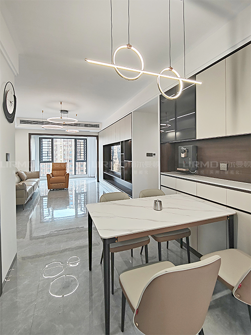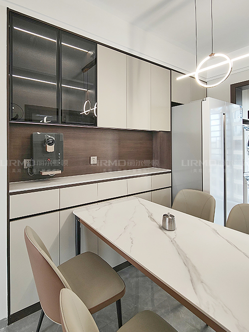 一整墻餐邊柜,中間臺(tái)面預(yù)留了插座,可放置一些小家電,其余柜子用來(lái)收納生活雜物,