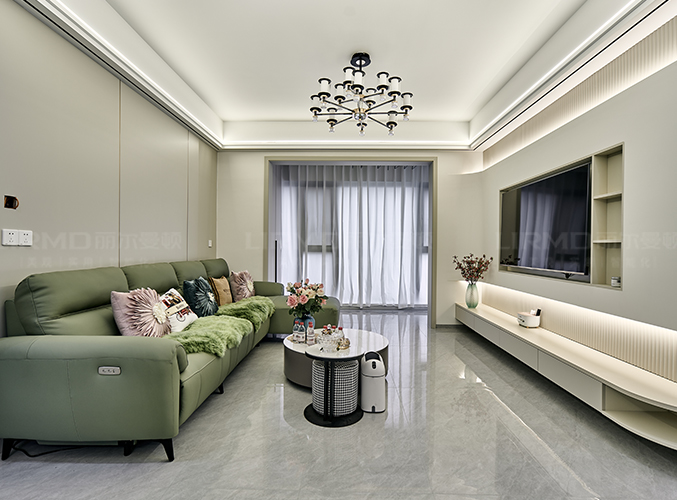 整屋通鋪瓷磚,盡顯大氣,封陽臺的通拉客廳,使空間感更大,電視背景墻留白整體