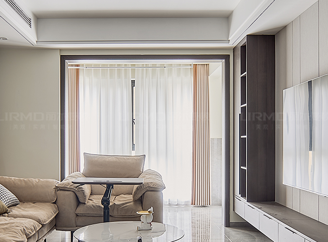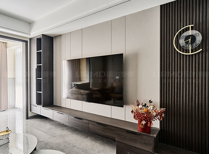 電視背景墻采用整面墻做儲物柜設計,整體效果不顯沉悶。