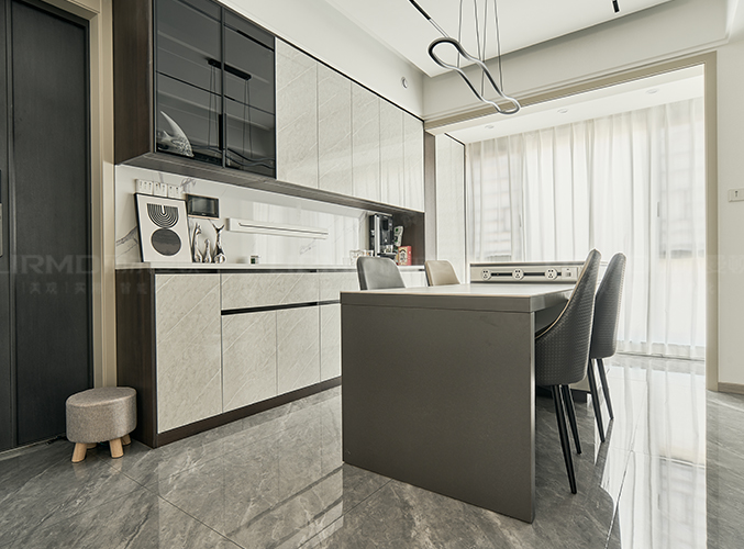 餐桌島臺設(shè)計,可以做西餐,下方是儲物柜,可以放家用小電器,島臺側(cè)面裝了軌道插座,