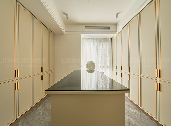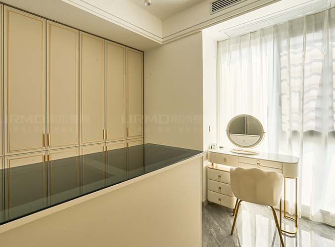 整面墻做衣柜,更加好分類,柜子象牙灰色鑲嵌金屬邊框,側(cè)邊做一個圓弧角處理,