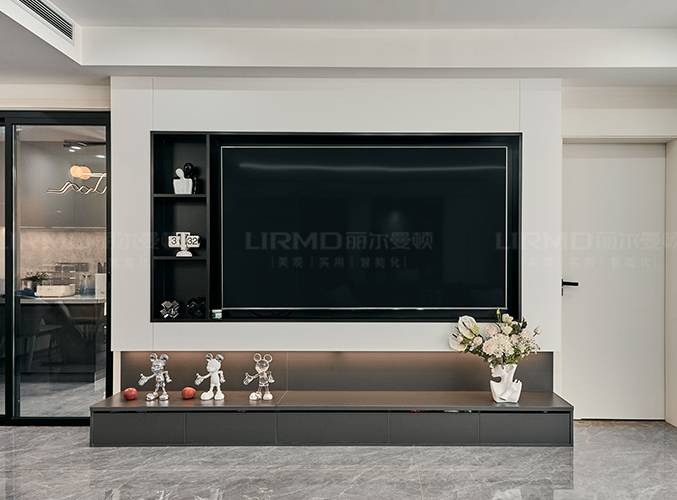 整屋通鋪瓷磚,明亮又顯大,采光好,視覺上更加干凈整潔,電視背景墻做內嵌式設計,