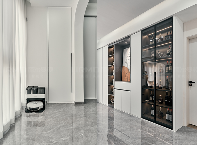 沙發(fā)背后一整墻的柜子設計,方便收納,右側玻璃展示柜柜門的設計更具設計感。