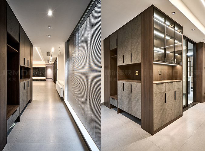 18mm厚杉木芯板,長廊兩側分別置鞋柜和儲物柜,視覺效果更好,下方懸空設計,好放置鞋子,