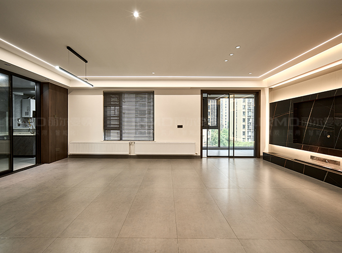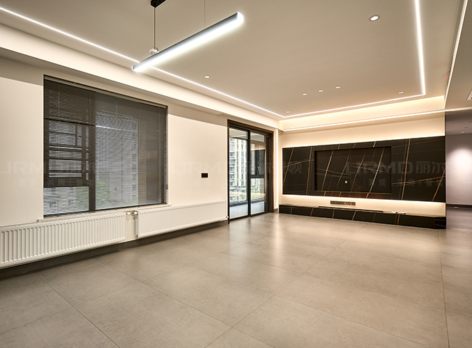 啞光淺灰地磚大氣整潔,疊級吊頂+無主燈設計增添高級感。