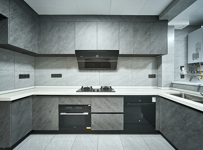 U型設計,櫥柜灰色超晶飾面搭配淺色橫磚整體統一,上下都有柜子,方便收納。