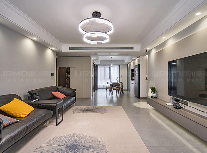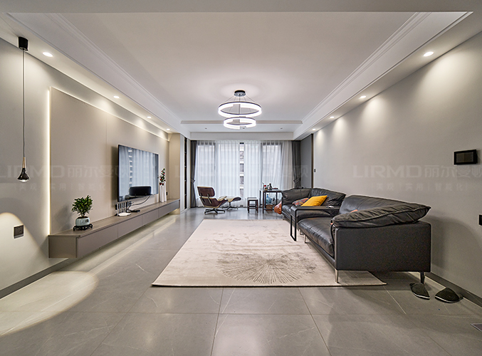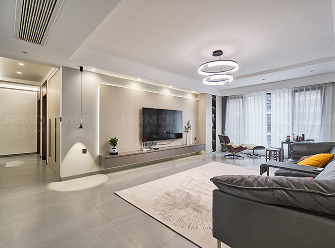 吊燈設計,增強照明實用性的同時又增貼了空間藝術感,灰色系色調搭配溫暖的燈光