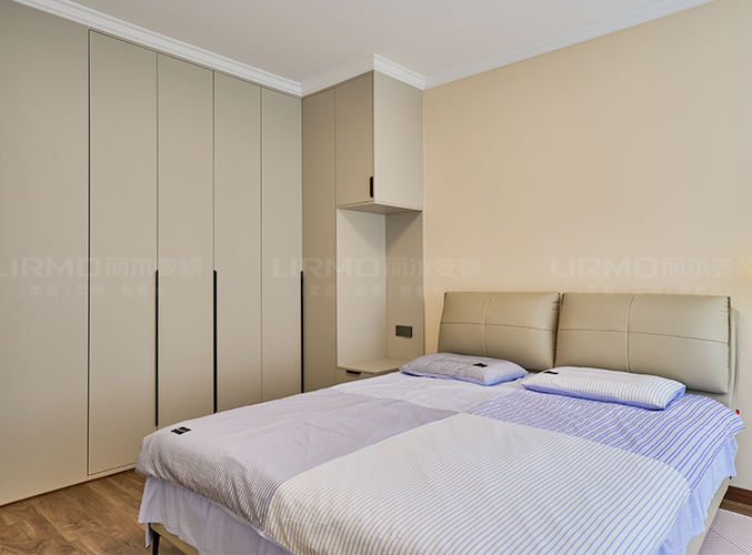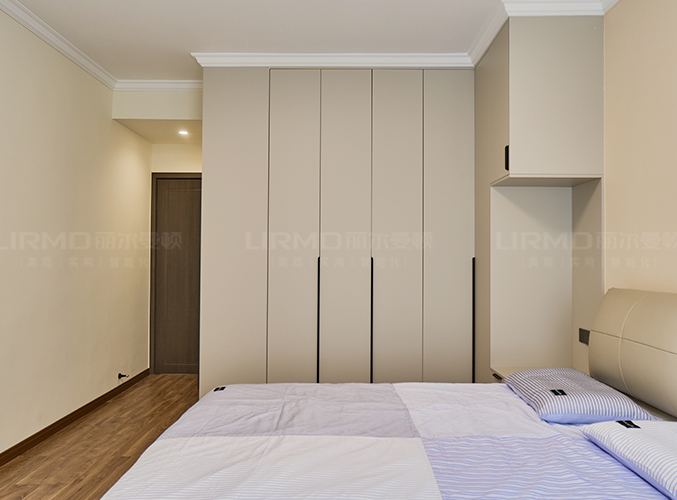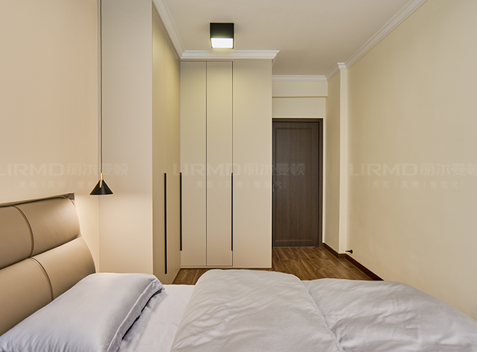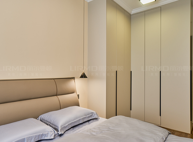 柜子一門到頂設計,實木柜體搭配PET膚感柜門,床邊搭配暖色系吊燈,