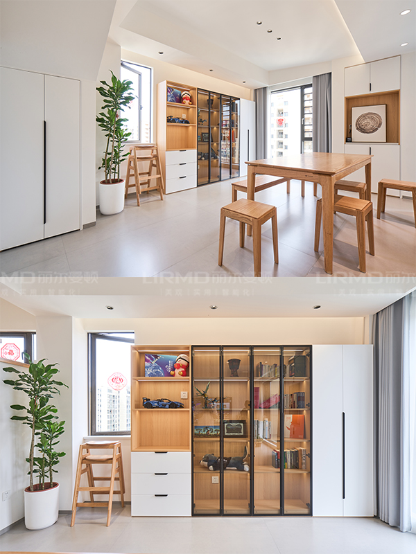 1、電視機背景墻收納 2、電視背景墻抽屜柜3、開放式書房收納柜 4、開放式書房小水吧臺柜 5、餐邊柜