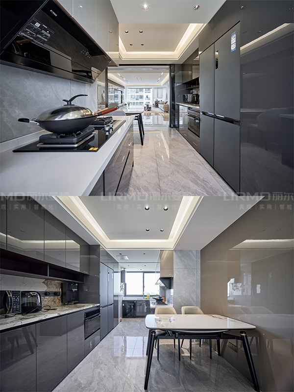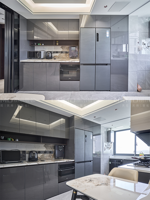 柜門采用奶咖閃銀LSB板PET膚感柜門,一門到頂