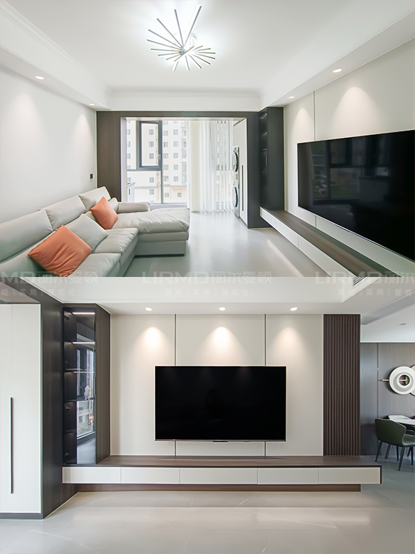 入戶鞋柜、電視機懸浮柜+展示柜、陽臺柜+洗衣柜、餐邊柜+收納柜、4個臥室衣柜+2個書桌+收納柜