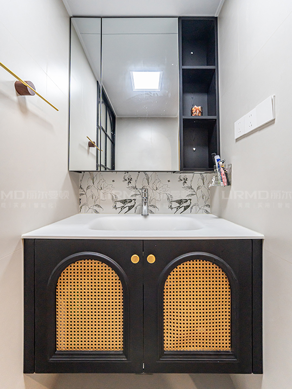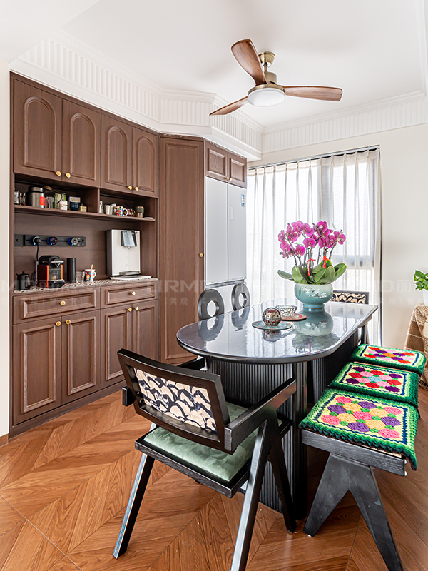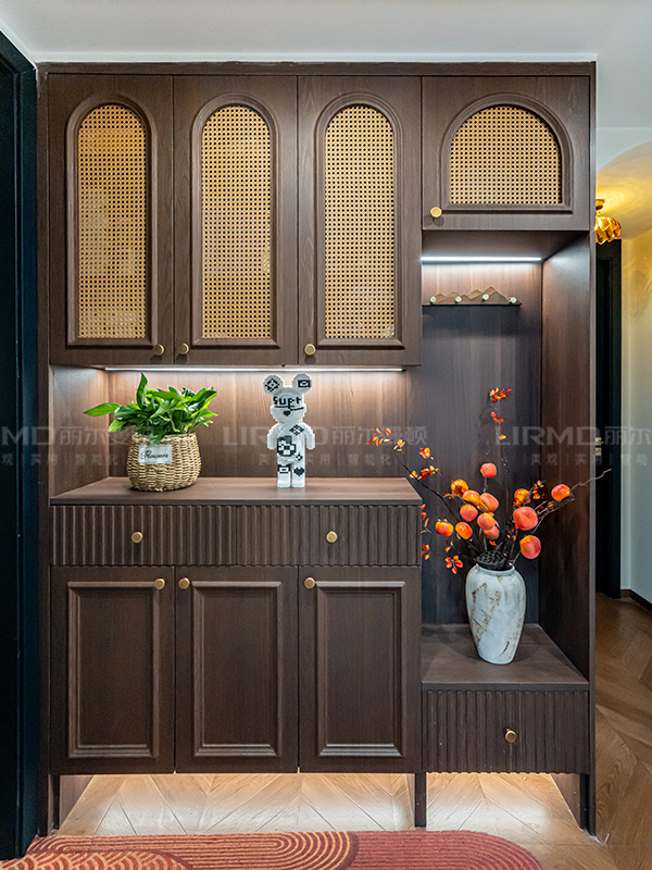 全屋定制用胡桃木色搭配榆木色。進門鞋柜和過道書柜采用部分藤編柜門,搭配金屬小拉手,讓空間層次感拉滿。
