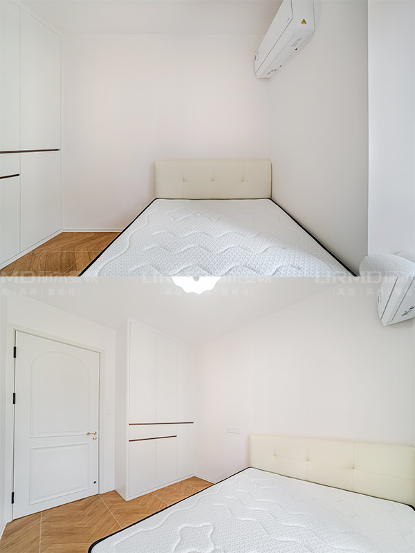 主臥室是長方形,通過調整橫向空間,在主臥室做到床尾柜加梳妝臺一體,方便實用。